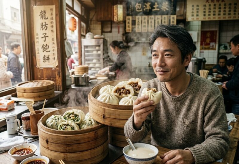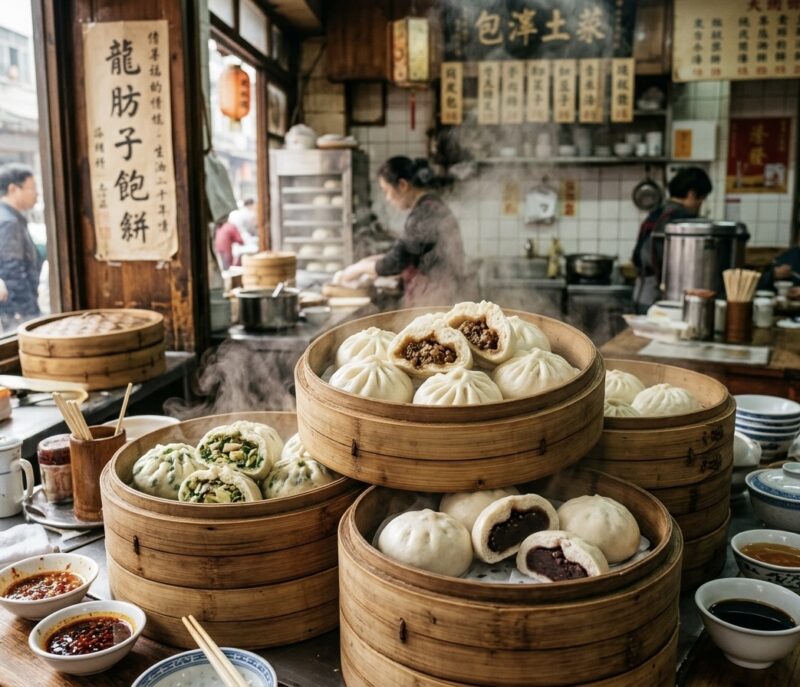 朝6時から8時ごろ、オフィスビルや地下鉄の入り口付近に包子の屋台が並びます。温かい豆乳(豆浆・ドウジャン)と包子のセットが定番の朝食で、私も10年間ほぼ毎朝このパターンでした。
